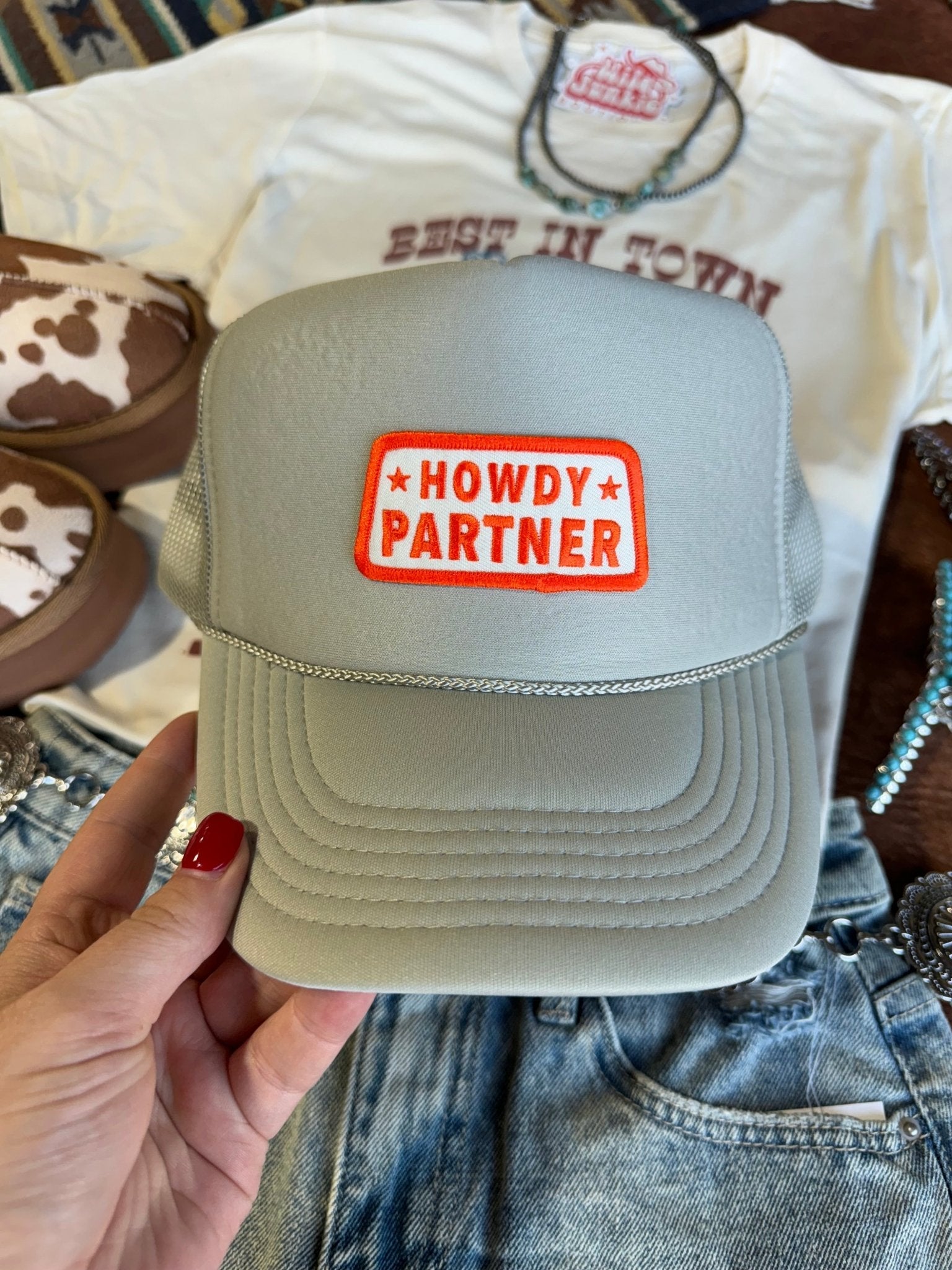 The Howdy Partner Patch Trucker Hat is a fun and stylish way to greet the day with a little Western flair! Featuring a bold “Howdy Partner” patch, this hat captures the spirit of the Old West while keeping you cool and comfortable. Perfect for cowboys, cowgirls, and anyone with a love for the West, it’s a classic accessory with a playful twist!